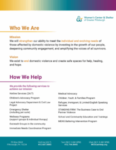 Women’s Center & Shelter of Greater Pittsburgh is a 501(c)(3) nonprofit organization — donations to which are tax-deductible to the fullest extent permitted by law. The official registration and financial information of the Women’s Center & Shelter of Greater Pittsburgh may be obtained from the Pennsylvania Department of State by calling toll free, within Pennsylvania, 1-800-732-0999. Registration does not imply endorsement. © 2025 Women’s Center & Shelter of Greater Pittsburgh. All rights reserved.